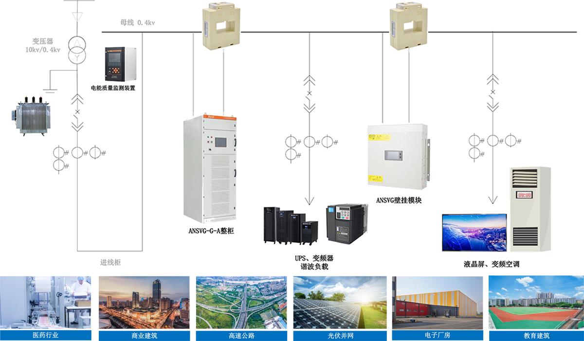 ANSVG静止无功发生器是一种用于补偿无功、谐波治理以及不平衡调节的新型电力电子装置。其基本原理为:检测补偿对象的电压、电流信号,计算提取无功分量或谐波分量,并生成相应的指令信号,通过驱动变流器模块的输出,产生一个与系统无功、谐波电流幅值相等、相位相反的补偿电流,从而抵消线路中的无功分量或谐波分量,达到无功补偿或谐波治理的目的。其应用可克服LC补偿器等传统的无功补偿器响应速度慢、补偿效果不能精确控制等缺点。